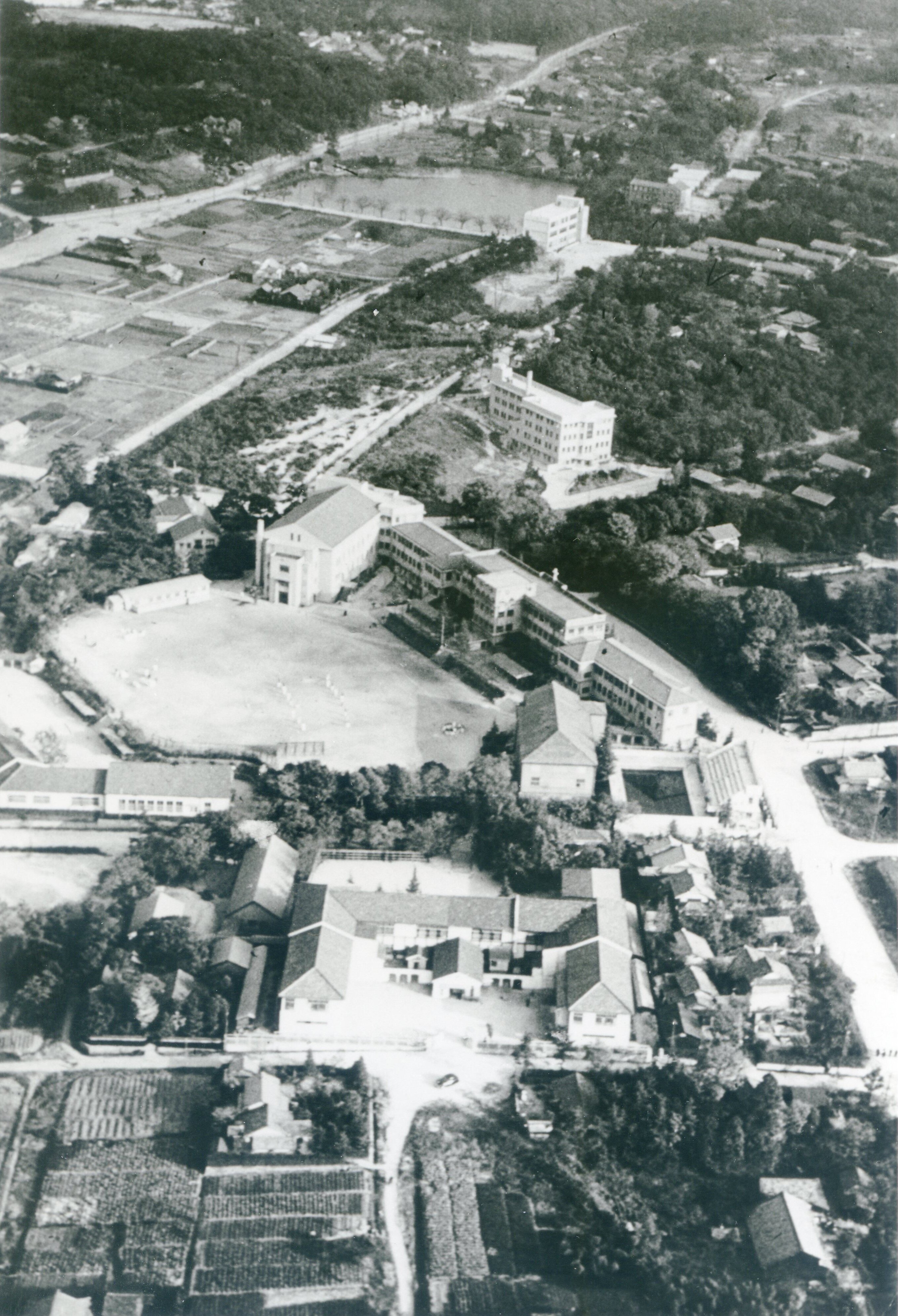 1956~57年頃の南山学園とその周辺。(移転した女子部(隼人町校舎)、新ピオ11世館、大学講堂、本館、カマボコ聖堂、至誠堂、プール、大学北校舎(女子部移転により大学が使用)、男子部)