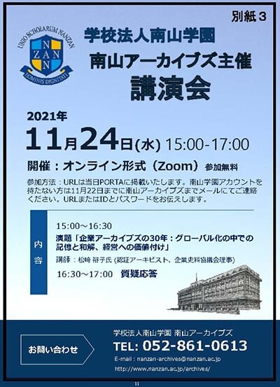 URLは当日PORTAに掲載いたします。南山学園アカウントを持たない方は11月22日までに南山アーカイブズまでメールにてご連絡ください。URLまたはIDとパスワードをお伝えします。