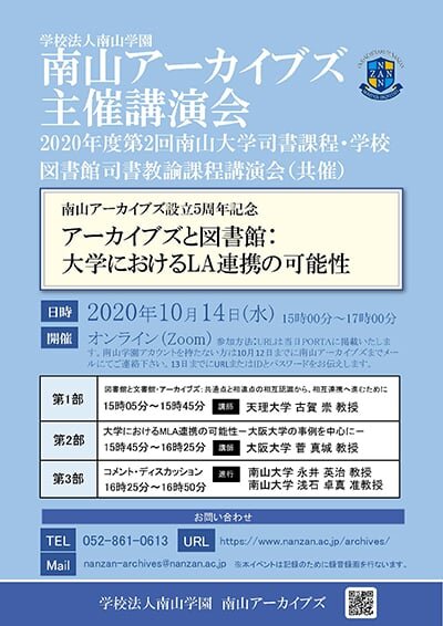 第2回南山大学司書課程・学校図書館司書教諭課程講演会(共催)南山アーカイブズ設立5周年記念アーカイブズと図書館:大学におけるLA連携の可能性