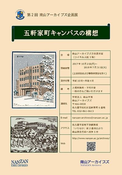 この展示では、ライネルス館を中心に施設が整えられてきた南山学園の五軒家町でのかつての姿を回顧していきたいと思います。