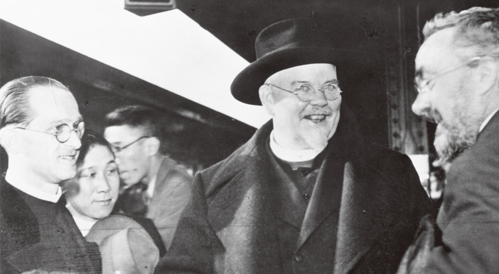 [写真]学園資金集めのために1年間かけて行った欧米旅行から帰還し、名古屋駅にて学園関係者より出迎えを受けたライネルス師(1937年)
