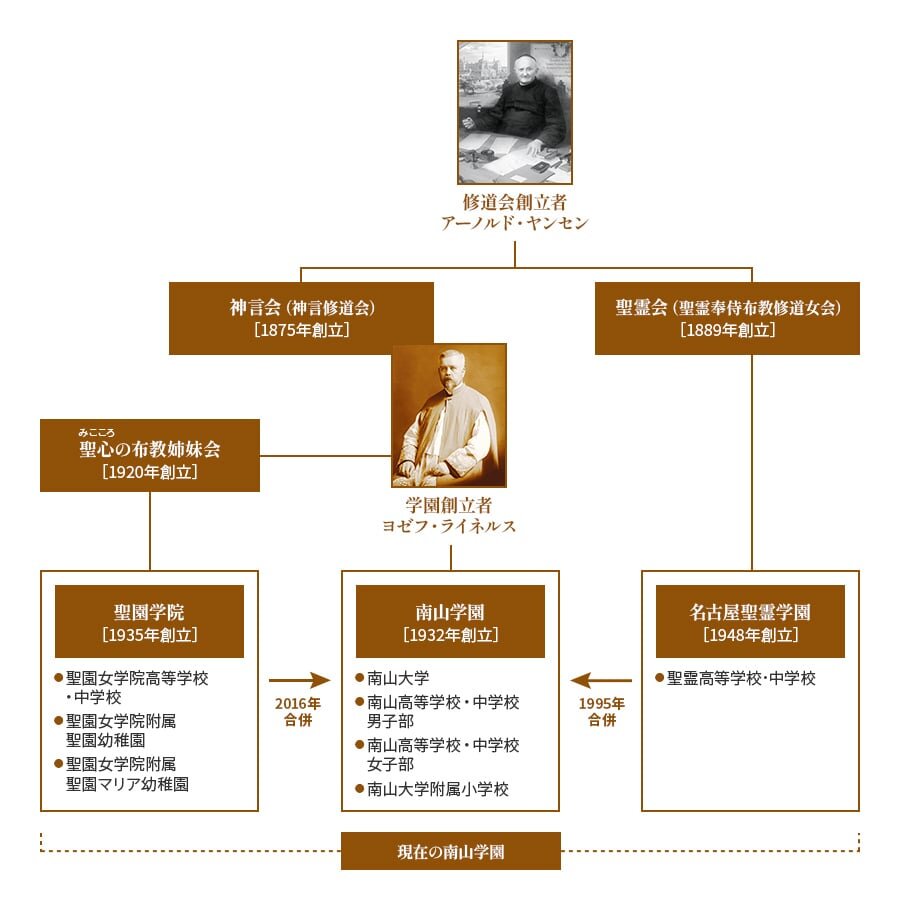 1995年(平成7年)には神言会と創立者を同じくする女子修道会・聖霊奉侍布教姉妹会(聖霊会)が経営する名古屋聖霊学園と、2016年(平成28年)には学園創立者ライネルス師が創立した女子修道会・聖心の布教姉妹会が経営する聖園学院と法人合併を行い、カトリックのつながりを大切にしながら、南山学園は、幼稚園から大学院までを擁する総合学園となりました。それはライネルス師が当初に構想した「初等教育から高等教育までの一貫教育を行う学園の創設」の実現でもあるのです。