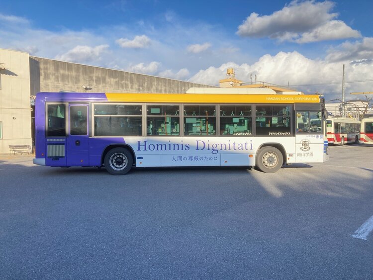 2026.01.15 名古屋市バスのラッピング広告掲出について 本学園のスクールカラーを基調としたデザインに、教育モットー「Hominis Dignitati(人間の尊厳のために)」を掲げ、2026年1月より、市内を運行しています。車体後方の本学園創立者ヨゼフ・ライネルス師の大きな写真が目印です。・名古屋市バス1台(猪高営業所エリアを運行)・掲出期間:2026年3月まで(4月以降も継続を予定)※運行ルート等について、名古屋市交通局、名古屋市バス営業所、バス職員へのお問い合わせはご遠慮ください。 【参考】市バス系統図(猪高営業所担当分) 戻る